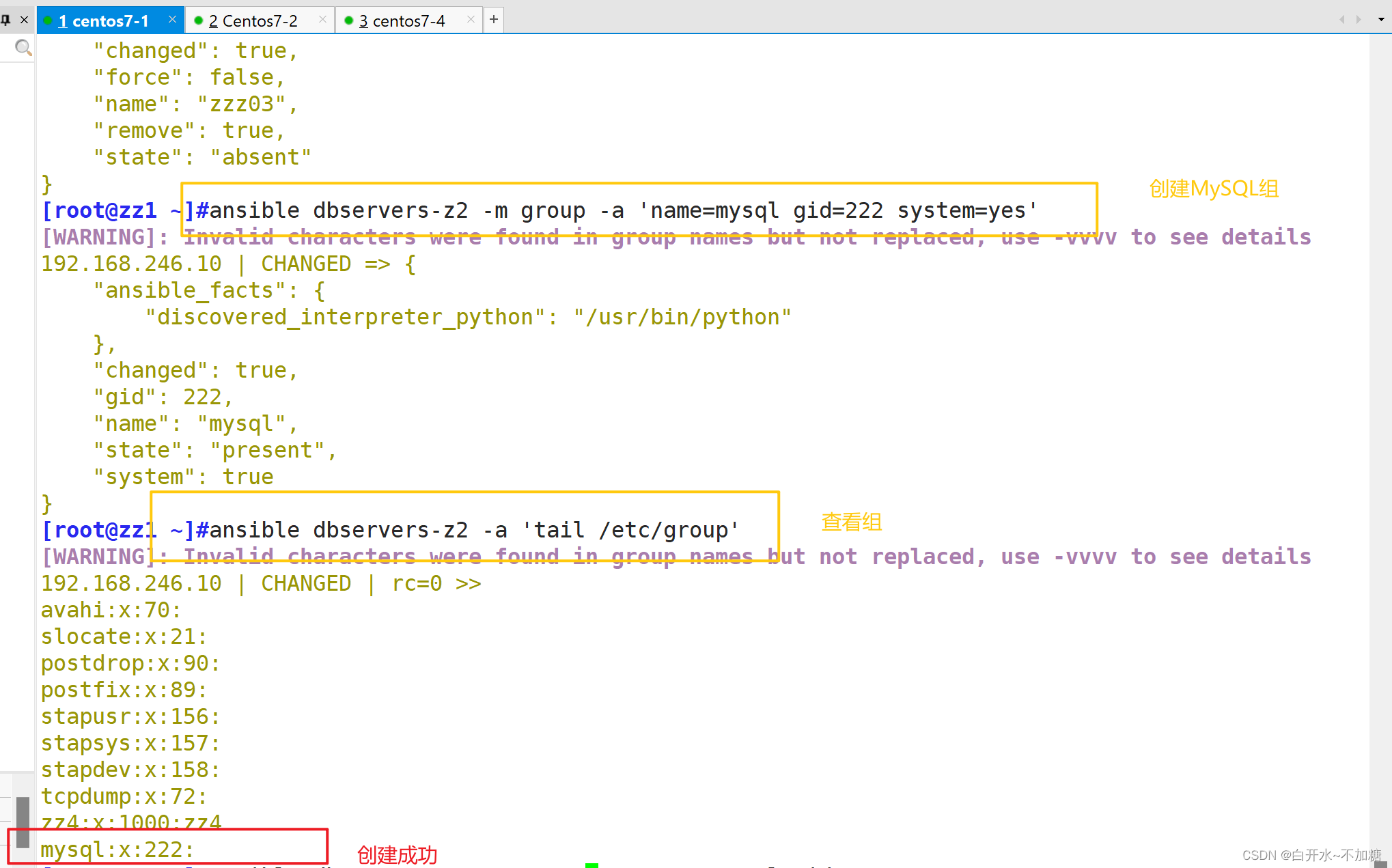 ansible dbservers-z2 -m group -a 'name=mysql gid=222 system=yes'