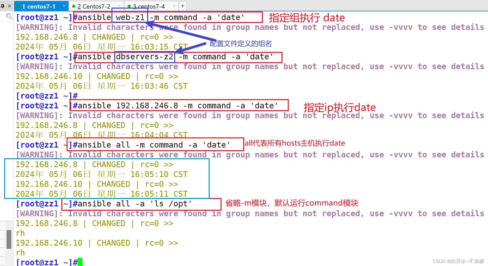ansible dbservers-z2 -m command -a 'date' #指定组执行 date