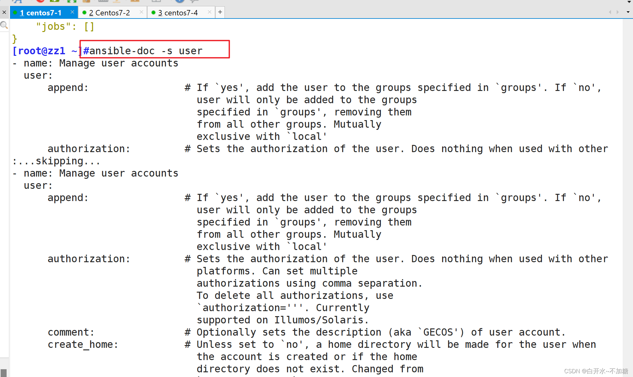 ansible-doc -s 模块名指导模块使用方法