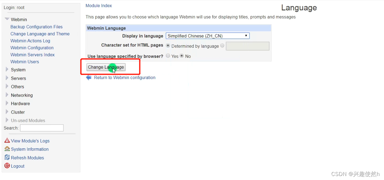 点击 Login 登录,可以看到就进入到了webmin界面了。