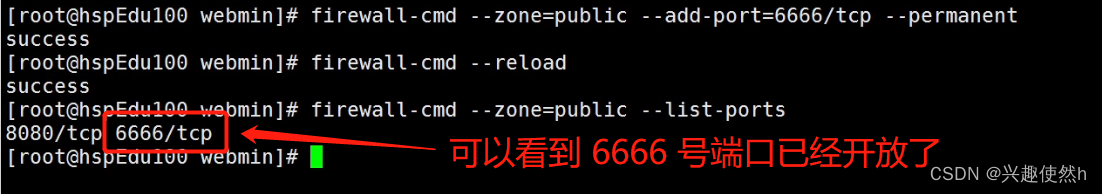 firewall-cmd --zone=public --add-port=6666/tcp --permanent # 配置防火墙开放 6666 端口