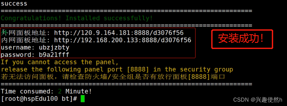 2)安装成功后控制台会显示登录地址,账户密码,复制地址到浏览器打开。输入用户名密码进行登录。(建议保存自己的用户名和密码)