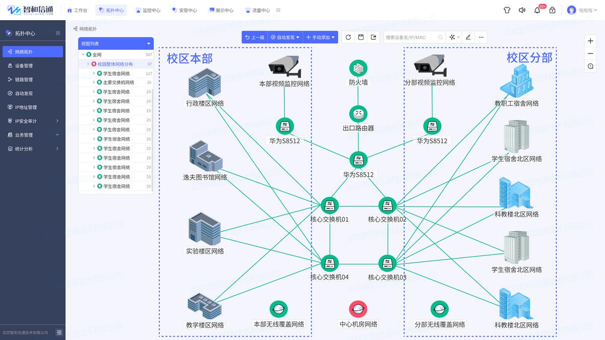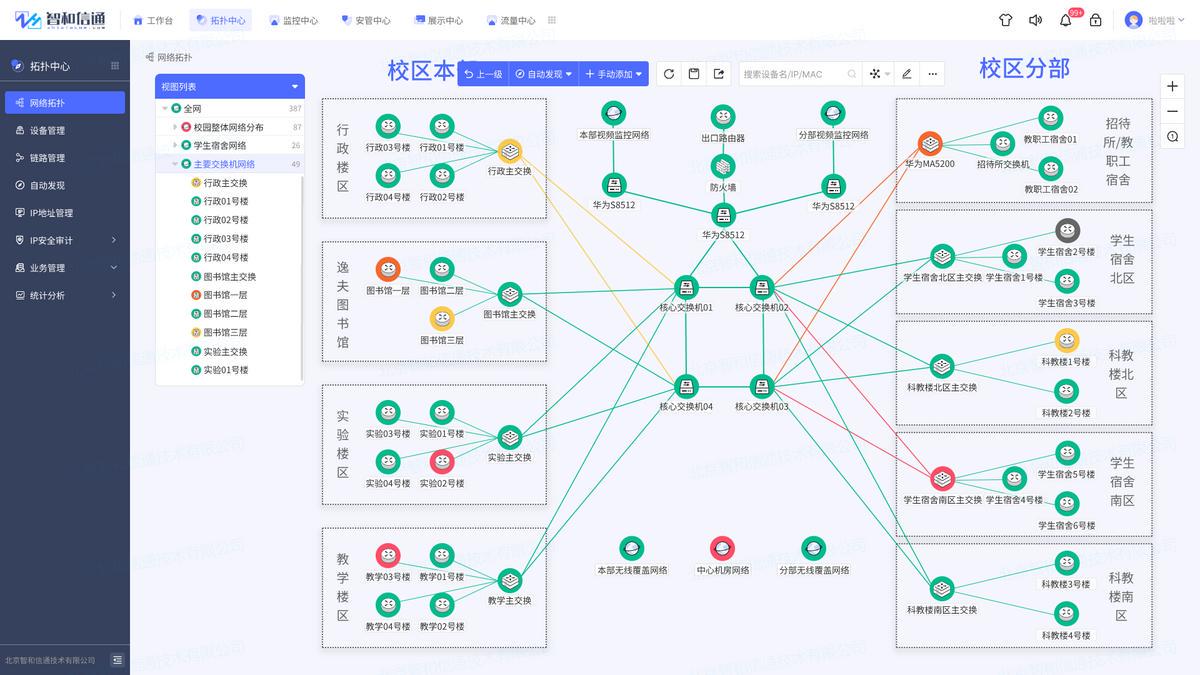 对于高校网络运维而言,网络跨校区、设备超大维护量是网络运维的难点,如何通过可视化的能力,将复杂的网络直观地展示出来,是其关注的重点。北京智和信通网络结构可视化能力,通过图形化、具象化的拓扑形式展现设备间的联动关系与实时状态信息,降低运维部门的维护难度,拖动式的布局形式使配置更加灵活,帮助运维人员实时了解网络架构及全网运行状态,快速感知资源、链路、流量等异常信息。