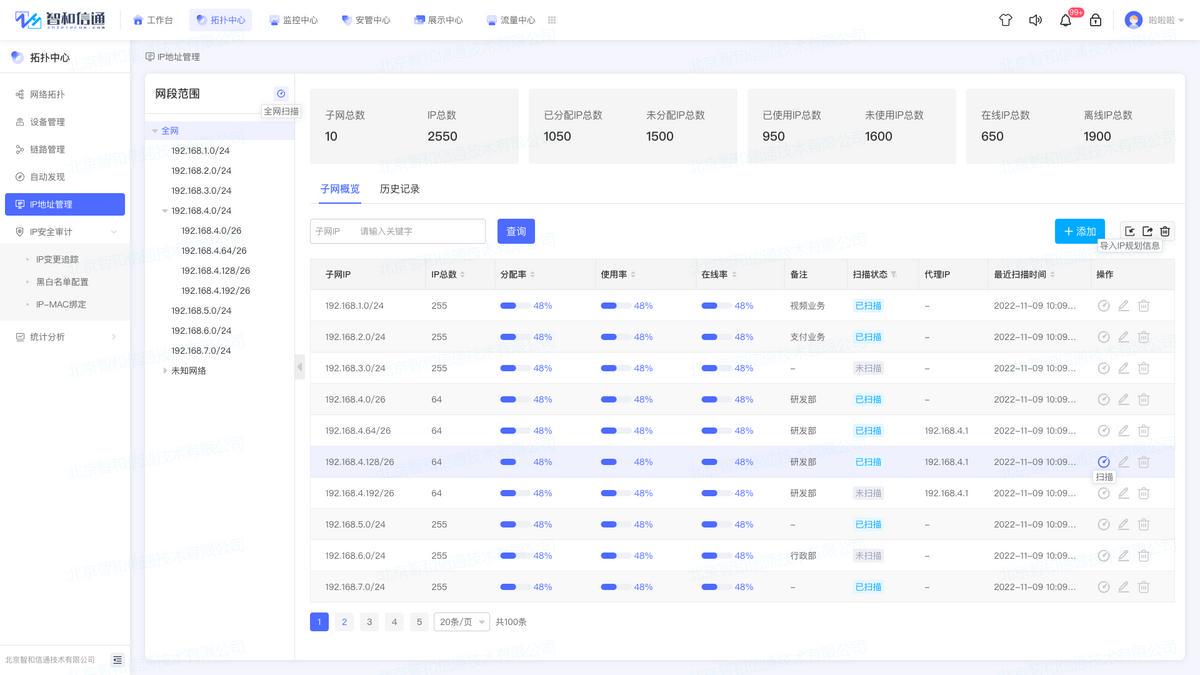 方案支持端到端规划、部署、管理和监控IP 地址。通过智能IP扫描能力,定义多层次子网,然后扫描其范围内每个IP地址的当前状态,包括IP地址,MAC地址等信息,也可以查看IP段内地址使用详情,便于学校进行IP地址分配管理等。