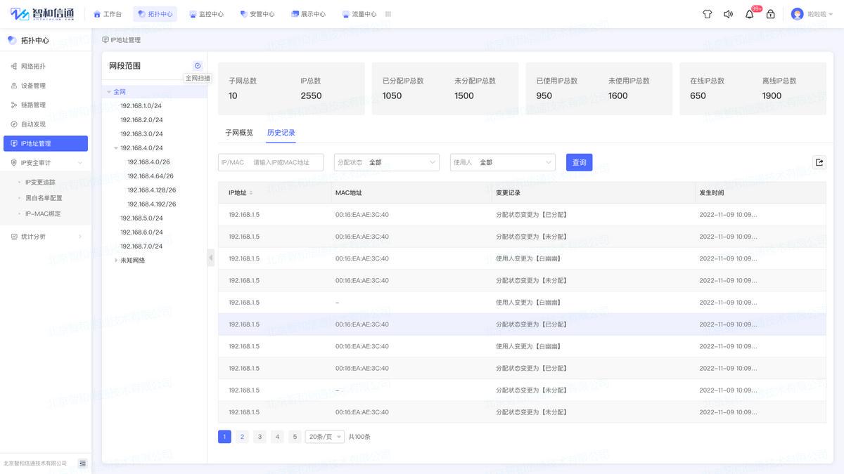 可追踪指定日期内,指定的IP地址的分配情况,匹配的MAC地址、使用人和变更记录。