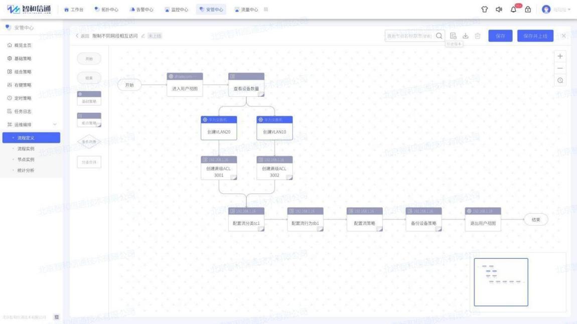 方案通过智和网管平台将高校网络运维中涉及的服务、命令、操作、执行组件化、策略化,将需要进行的运维服务、操作等以组件、策略的形式托管至平台中进行维护和管理,用户根据需求从策略库中选取对应的策略,并采取可视化拖拽的编排方式装配成运维业务流程,最后触发执行即可完成期望的运维变更任务,从而实现高效、稳定、安全的智能运维。