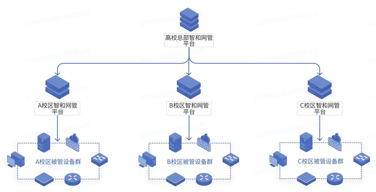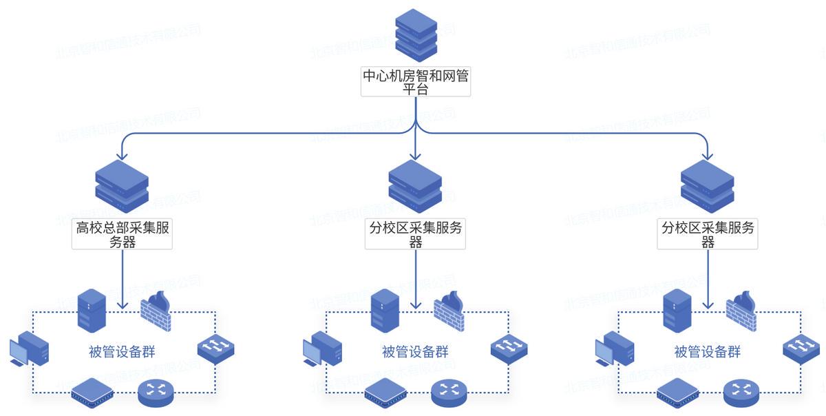 在智和信通高校网络运维分布式部署方案中,采取核心网络部署综合运维平台,下级网络部署采集器的方式,用户可以在综合运维平台建立多个账号,进行权限划分,对下级网络进行管理。整个分布式部署方案采用综合运维平台-设备集的结构,综合运维平台获取不同设备集的监控信息,综合运维平台可以管理所有设备,实现对每个设备集中网络设备运行数据的采集、管理、存储。