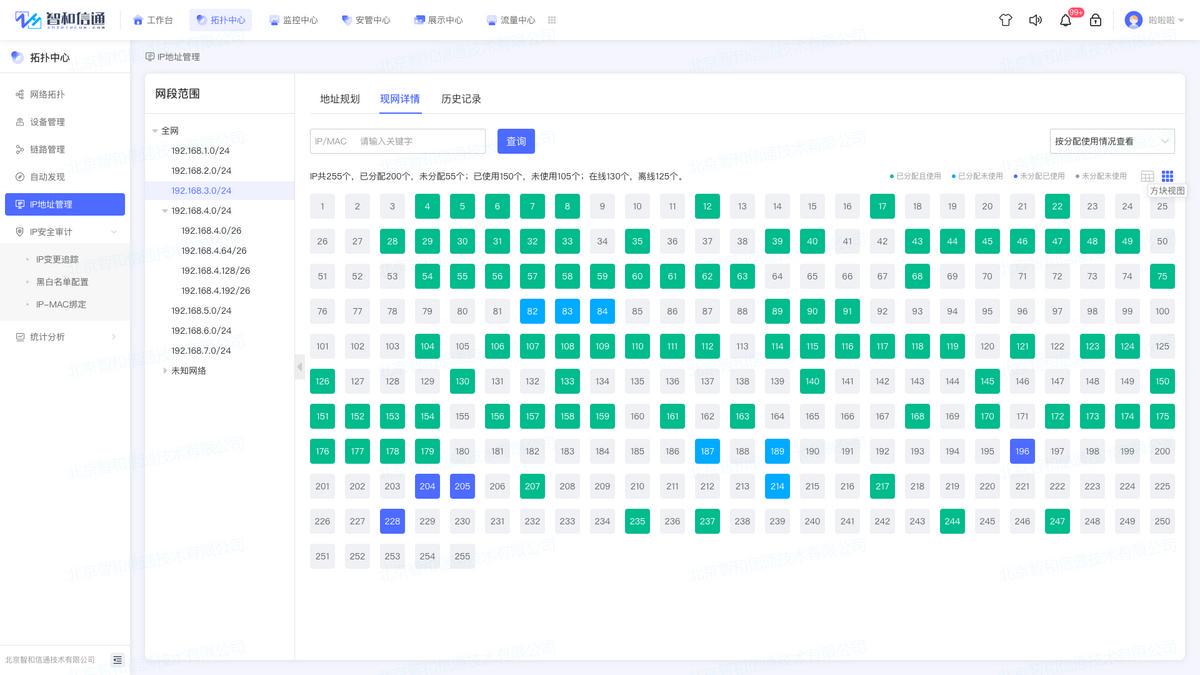 支持通过端口视图及列表视图的形式,展示当前IP地址的使用情况,可查看某个子网的IP现网详情信息,如IP、掩码、主机名、设备类型、现网MAC、现网接入设备、现网接入端口、规划MAC、规划接入设备、使用人等,可批量分配IP地址。