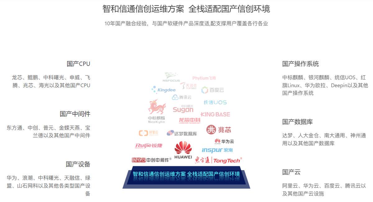 智和信通国产信创能力采用Java、HTML5跨平台技术,全面兼容国产化操作系统、数据库、中间件、CPU和虚拟化等,支持包括:中标麒麟、银河麒麟、中科方德、达梦、人大金仓、南大通用、神州通用、华为虚拟化、H3C虚拟化、深信服虚拟化等。