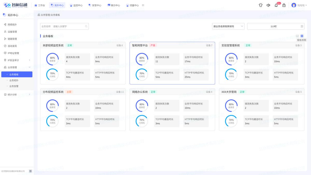 通过部署北京智和信通高校一体化运维方案,可以实现对高校网络、业务、应用系统的24小时不间断监控,做到事前预警,解决被动救火的局面。通过多种拓扑方式,直观、全面展示被管设备的实时运行状态,整合业务、流量、资产、工单等能力,为运维人员全面掌控所辖范围内智慧校园网络状况提供基础。