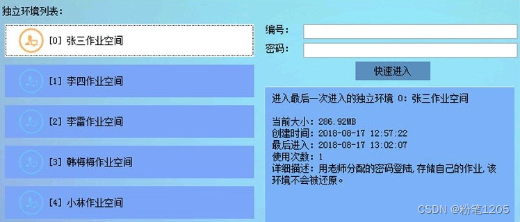 除了基本的功能创建还原点外,管理端还可以批量创建Windows账户,通过导入Excel文件批量创建用户名及密码,建立计算机等级考试环境;管理端还可以在同一台电脑上为每个学生创建不被还原的个人作业空间,学生通过密码登录自己的独立空间,永久存储个人作业或者课件资料等。
