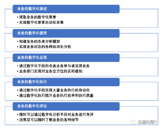 一个业务要数字化要在几个核心的环节上实现逐步的数字化,才能够逐步提升业务的数字化能力,达到支撑业务优化、提高业务效率的作用。