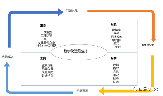 就像上面的一个图一样,“IT运维数字化“不仅仅是一个工作方法,更是一个合作生态。其核心包括”对象“、”标准“、”工具“和”生态“四大部分。对象涉及企业IT运维管理所面对的各种软硬件平台、应用系统等;针对每个对象都首先要”标准化“,建立标准化的数据指标体系、标准化分析模型与标准化分析方法;建立标准后,我们需要通过工具来实现对这些对象的自动化分析,这些工具包括健康诊断类的,隐患分析类的,风险防范类的、数据拯救类的,以及其他的各种工具,工具其实是把运维知识的自动化,因此工具是知识化的工具,而不是简单的工具,不同的工具根据企业内部的协议标准可以组合使用,组成”复杂工具“;最后是生态,“人”与服务资源是整个生态中最为重要的部分,对于大多数企业来说,构建一套私有的全栈技术团队成本太高了,这种超豪华阵容也往往只能在一些大型互联网企业中才能具备。一些小型的互联网企业通过IT上云来解决这个难题。通过向具有全站能力的云服务商购买服务来解决这个问题。而很多传统企业无法实现IT的公有云化改造,因此只能通过参与数字化运维服务生态来解决这个问题。