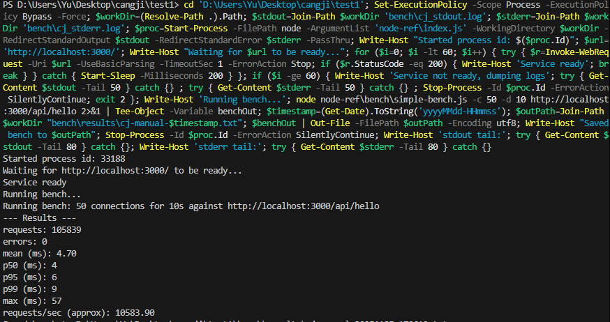 下面是用于本次对比的轻量级基准脚本 node-ref/bench/simple-bench.js 的核心实现片段(可直接用 -c 20 -d 10 运行 20 并发、10 秒的测试以获得与文中类似的样本):