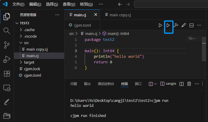 src -> main.cj可以看到默认创建的一段helloworld代码 - 点击右上方三角按钮运行项目