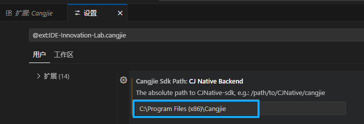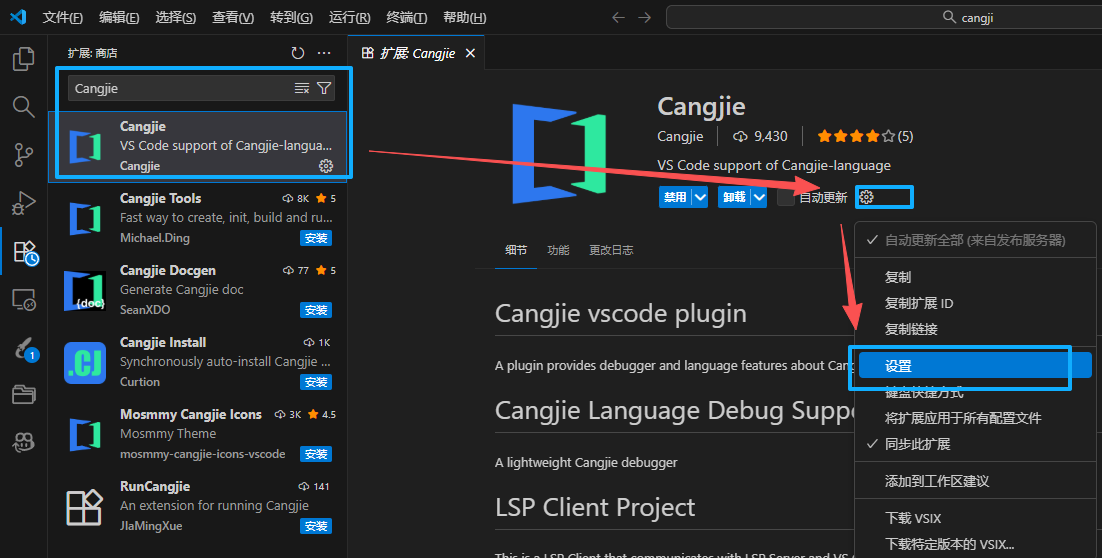 如图点击左侧Extensions -> Cangjie插件 -> 齿轮图标 -> Extension Settings
