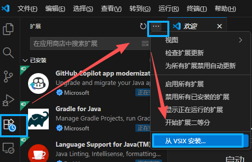 打开VS Code,如图点击左侧Extensions -> Views and More Actions -> Install from VSIX,找到刚才解压出来的Cangjie-0.51.4.vsix文件。安装成功。