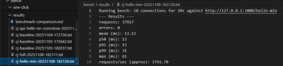 然而,仓颉在稳定性上给了我们惊喜。对于 /hello-min 和 /api/hello 这样简单的业务路由,仓颉实现表现出了极其稳定的零错误率,证明其底层网络栈在标准负载下是可靠的。
