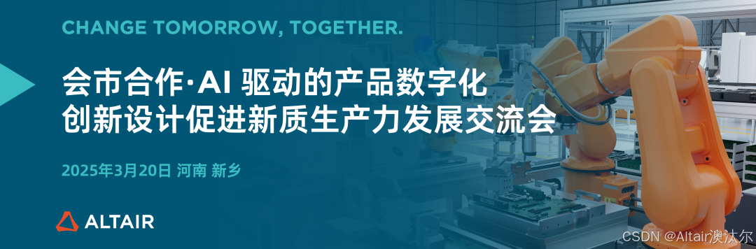 为了助力河南新乡地区制造业数字化再升级,3月20日,Altair 将携手河南省机械工程学会、新乡市科学技术协会共同举办AI 驱动数字化创新设计促进新质生产力发展交流会。本次会议聚焦 CAE 软件工具与 AI 驱动的数字化设计方法,旨在通过技术赋能,助力企业实现从“经验驱动”向“数据驱动”的跃迁。