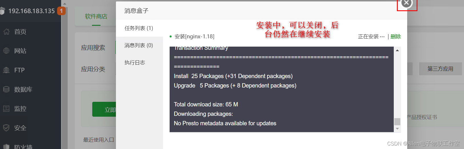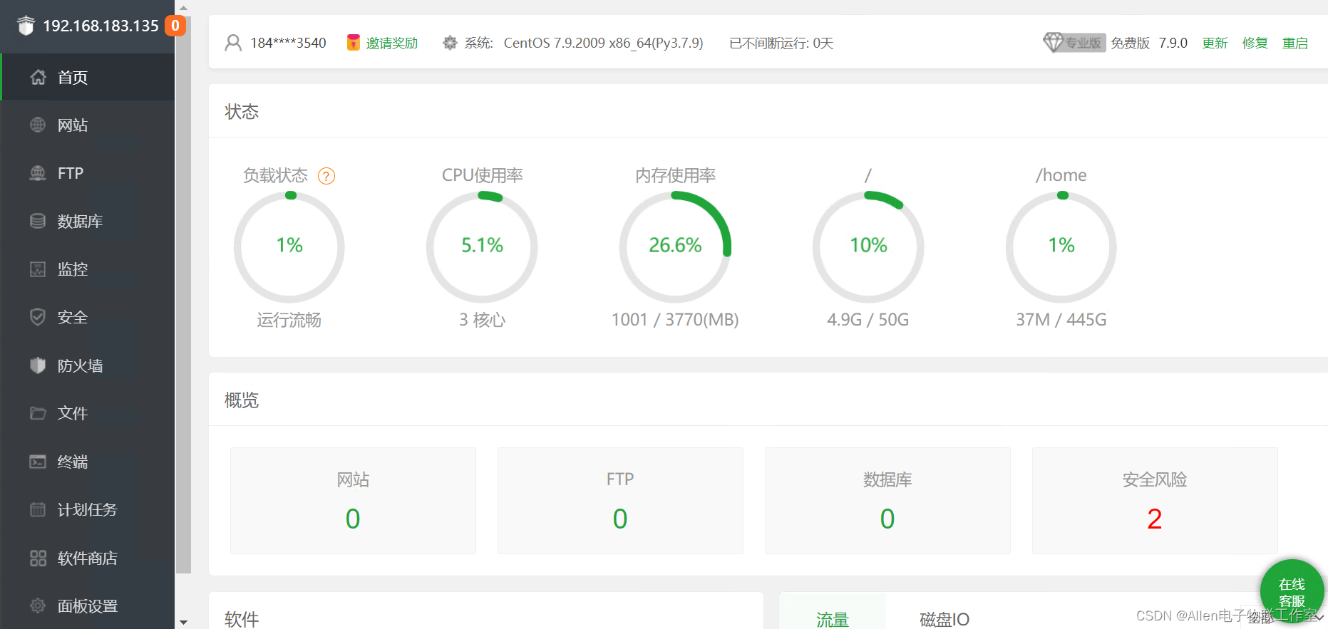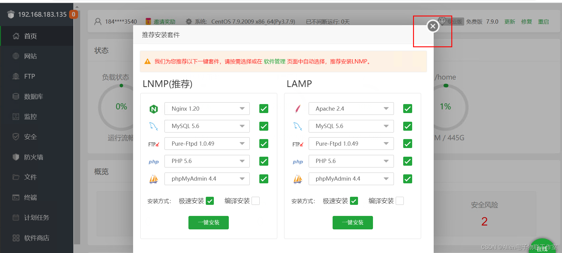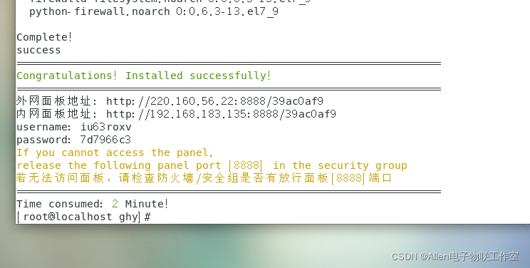centos7.9系统切换到root用户:执行以下命令:等待几分钟安装完成即可。外网面板地址: http://220.160.56.22:8888/39ac0af9内网面板地址: http://192.168.183.135:8888/39ac0af9username: iu63roxvpassword: 7d7966c3If you cannot access the panel,release