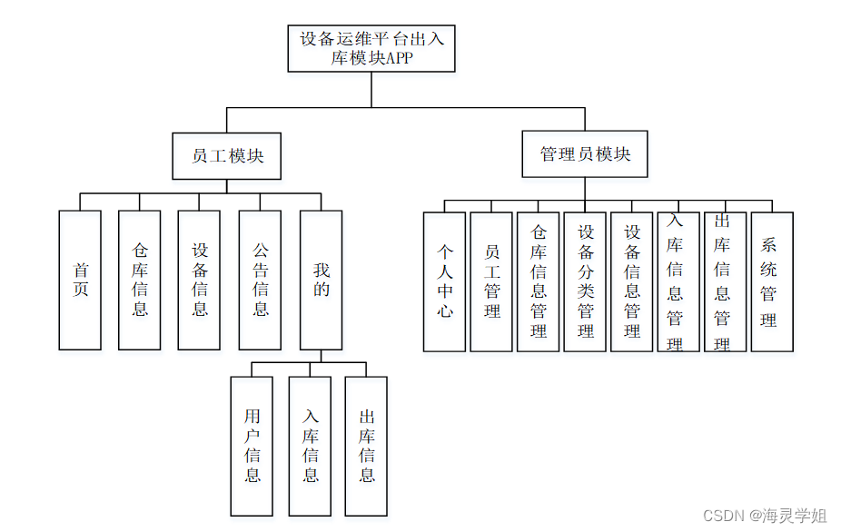 根据一般设备运维平台出入库模块APP的功能需求分析,本系统的功能模块如下: