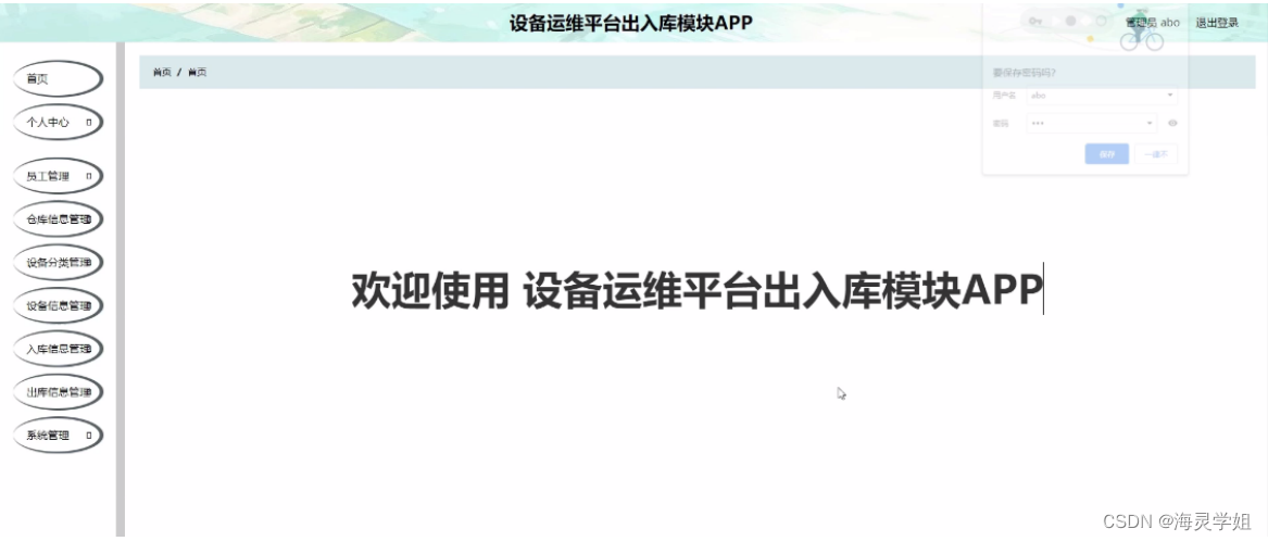 用户根据账号登陆进入设备运维平台出入库模块APP,系统根据用户的角色展示相应的功能权限。用户可以修改个人信息和密码,可以对入库信息、出库信息、设备信息、公告信息等进行详情操作。管理员拥有系统所有功能权限,可以管理系统,管理用户的信息。