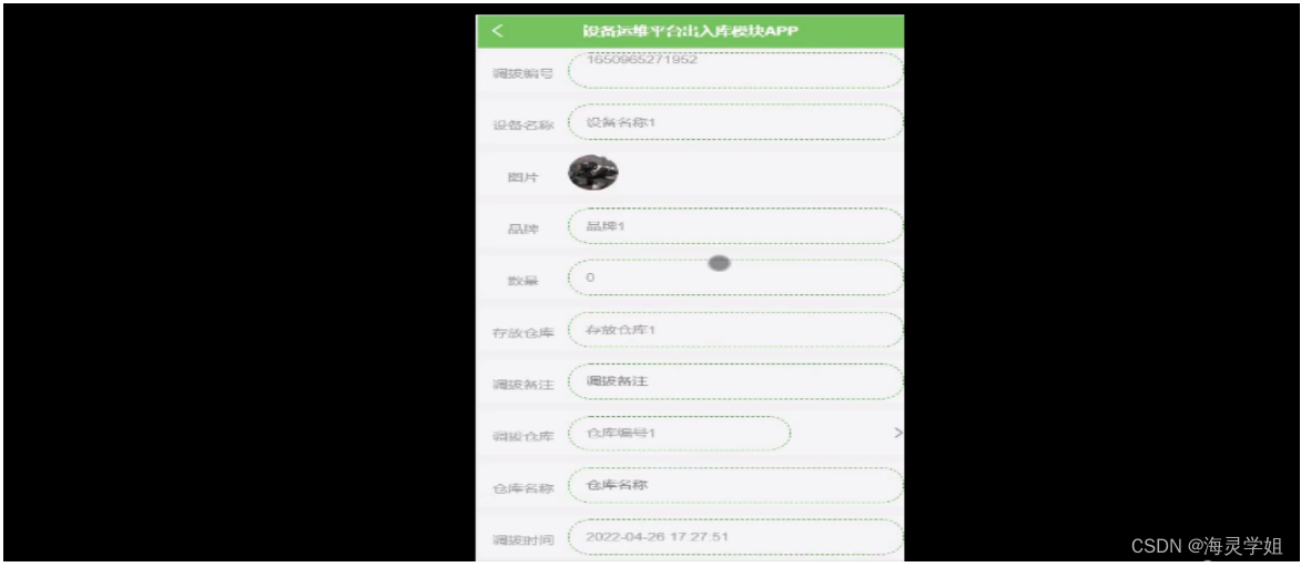 调拨,员工可通过输入调拨编号、设备名称、图片、品牌、数量、存放仓库、调拨备注、调拨仓库、仓库名称、调拨时间、员工工号、员工姓名等内容进行提交等操作,如图5-7所示。