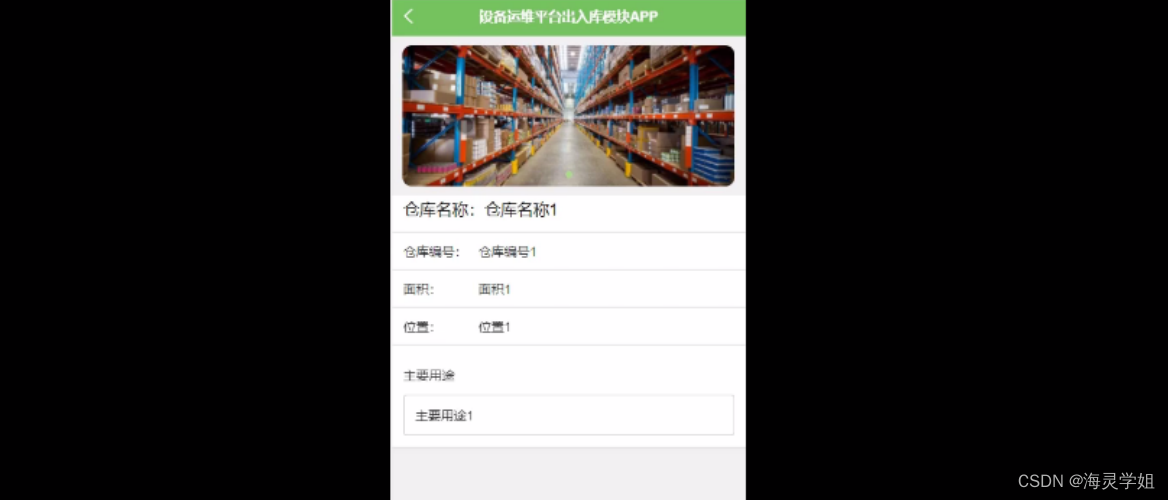 仓库信息,员工可在仓库信息页面查看仓库名称、仓库编号、仓库图片、面积、位置、主要用途等内容,如图5-4所示。
