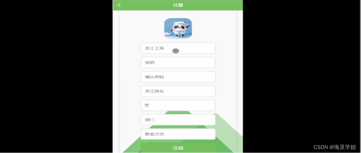 员工注册,员工通过输入员工工号、密码、员工姓名、性别、部门、联系方式等内容进行注册,如图5-1所示。