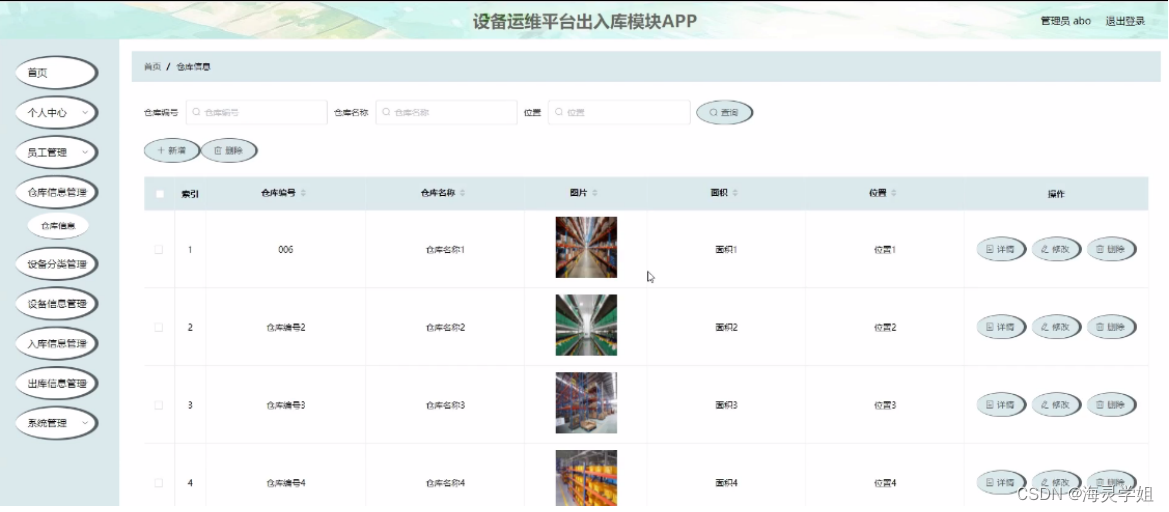 仓库信息管理,管理员可在仓库信息管理页面查看仓库名称、仓库编号、图片、面积、位置等内容,还可进行新增、修改或删除等操作,如图5-11所示。