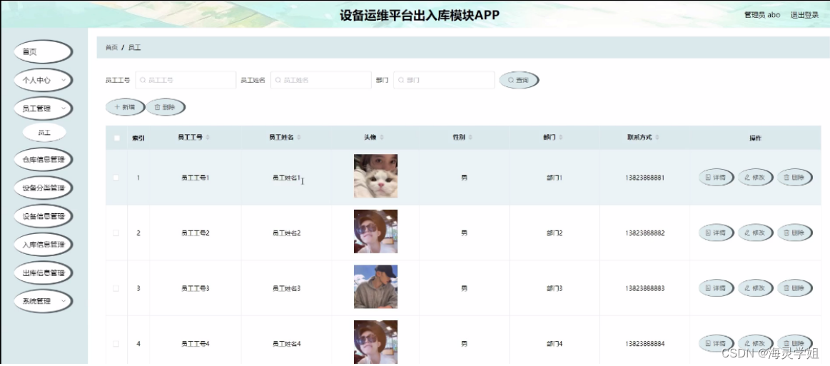员工管理,管理员可在员工管理页面查看员工工号、员工姓名、头像、性别、部门、联系方式等内容,还可进行新增、修改或删除等操作,如图5-10所示。