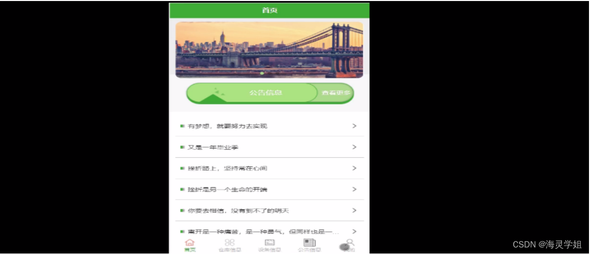 员工通过登录进入系统可查看首页、仓库信息、设备信息、公告信息、我的等内容,如图5-2所示。