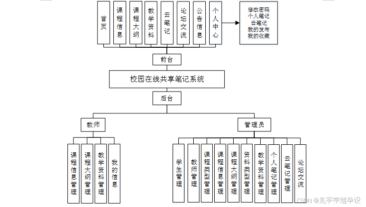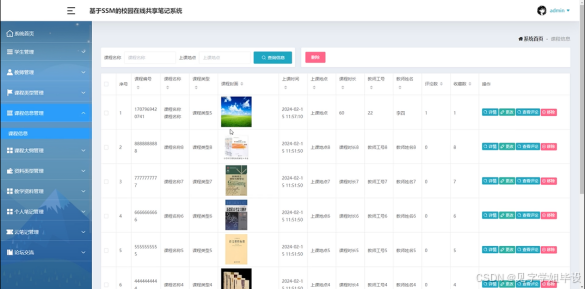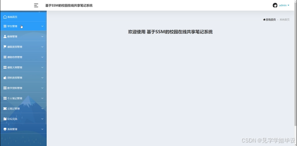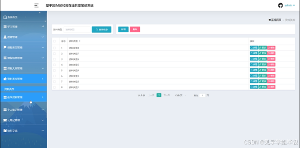 管理员登录进入系统直接管理系统首页、学生管理、教师管理、课程类型管理、课程信息管理、课程大纲管理、资料类型管理、教学资料管理、个人笔记管理、云笔记管理、论坛交流等信息。本系统模块设计的独立性强,用户体验良好、后期维护修改管理十分方便。