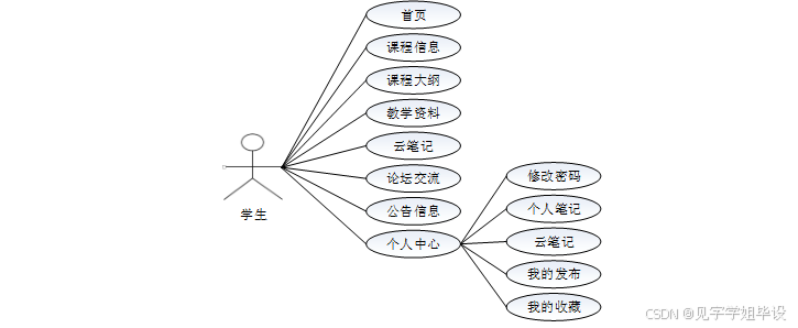 学生模块的主要设计是:在登陆成功后,本系统实现对首页、课程信息、课程大纲、教学资料、云笔记、论坛交流、公告信息等功能进行详细操作;