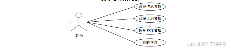 教师模块的主要设计是:在登陆成功后,本系统实现对系统首页、课程信息管理、课程大纲管理、教学资料管理、我的信息等功能进行详细操作;