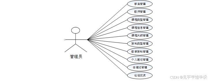 本系统分为管理员、学生和教师三大模块,管理员的权利是最大的,可以对系统所有功能进行管理;其次是学生和教师;用例分别如下所示: