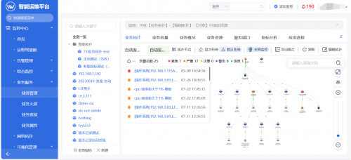 业务服务是乐维监控的一个比较特色的功能模块,在运维监控系统中比较少见。它的核心是业务拓扑,就是它可以自动发现业务背后的资源依赖关系并生成业务拓扑图,比如说企业的CRM系统需要依赖的服务器、数据库等,都能识别出来,业务拓扑关联告警异常显示,可以快速找到故障点所在。此外,比较有意思的还有业务容量、指标分析、应用进程、业务大屏、业务巡检等。例如通过业务容量可以看到业务资源是否接近性能瓶颈,是需要进行扩容还是资源回收。
