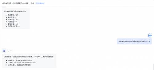 此外,比较令人惊喜的是,以ChatGPT为代表的人工智能方兴未艾之际,乐维在以人工智能赋能运维方面布局也有了初步成果。在体验乐维智能监控平台的同时也顺带体验了乐维的新品——Lerwee AI,智能运维助理。通过对接乐维的运维产品,用户可以像ChatGPT一样以对话的交互方式获取系统信息、生成工单等。基于平台,不止于平台;也许不久的将来,IT运维将会摆脱平台交互界面,完全通过AI进行交互,实现“不见平台,只见AI”,可能这就是人工智能的魅力。