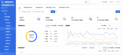 告警统计:包括分析、触发器告警TOPN、对象告警TOPN、恢复告警时长TOPN、未恢复告警时长TOPN标签。告警统计对于告警的运营管理很有意义,在分析部分,通过选择时间段,显示告警总数、已关闭告警数、未关闭告警数等信息。告警级别分布通过饼状图能很好的展现,告警趋势也能看出不同级别告警随着时间的实际变化。