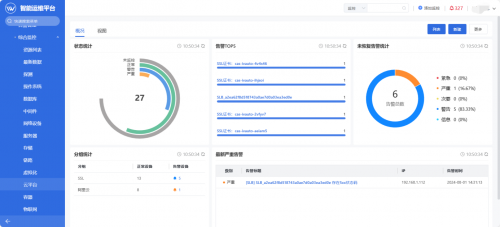 页面左侧是产品功能菜单,包括首页、运维驾驶舱、告警管理、综合监控、业务服务、网络拓扑、可视化管理、知识库等。右侧是整体的监控概况与监控重点,其中监控概况依资源类型分类,可以清晰的看到资源种类、数量、告警级别与数量,监控重点包括CPU、内存等使用TOP5情况,所有的监控数据都被组织得井井有条,让用户能够快速获取所需信息。支持探测、操作系统、数据库、中间件、网络设备、服务器、存储、链路、虚拟化、云平台