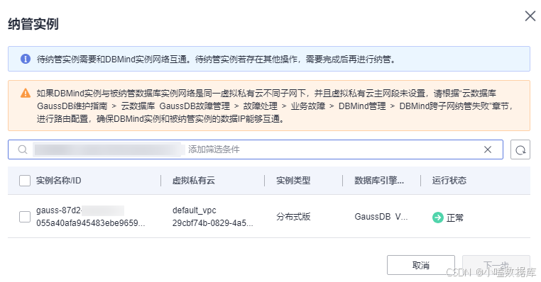 - 勾选需要纳管的GaussDB数据库实例,单击“下一步”。
