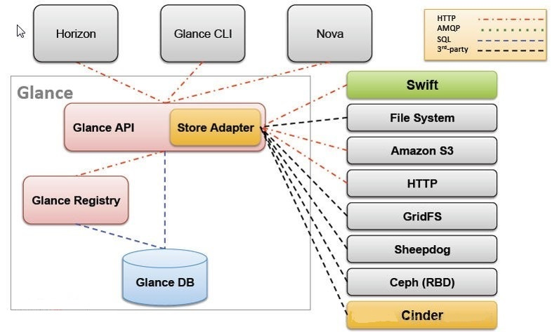 ● Store Adapter:是一个存储的接口层,通过这个接口,glance可以获取镜像,image store支持的存储有Amazon的S3、OpenStack本身的Swift,本地文件存储和其他分布式存储。