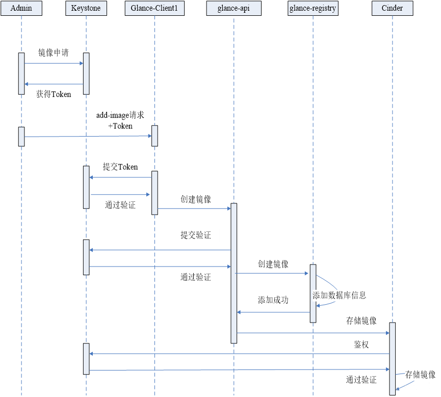 如图1-4所示介绍了Glance组件在申请镜像是所与OpenStack平台进行交互的流程图。