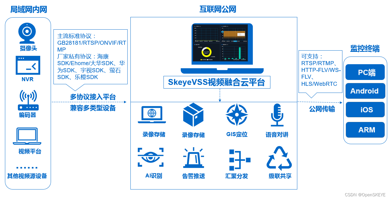 支持兼容不同品牌、不同型号、不通类型的视频流、设备、监控平台接入SkeyeVSS平台,解决技术兼容性问题,可快速对接开发第三方平台,融合构建工厂智能化一站式视频共享管理平台。