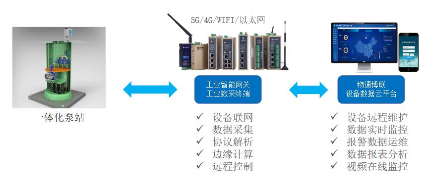 针对上述问题,物通博联提供基于工业智能网关的物联网解决方案。通过将工业智能网关部署到泵房控制柜并接入PLC中,就能进行数据采集和边缘计算,并通过5G/4G/WIFI/以太网等方式对接到云平台或本地上位机中,从而实现对现场水泵、阀门等设备状态的组态监控、自动告警、远程控制、远程维护等功能,并建立起规范化的运维工作机制,确保设备运行安全稳定,商场各个设施可以安全稳定用水。