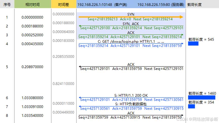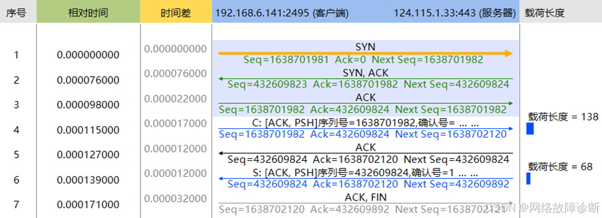 - 6号包序列号尾号为9824,实际有效载荷为68字节,因此客户端在7号包使用9824+68=9892作为确认号进行确认。