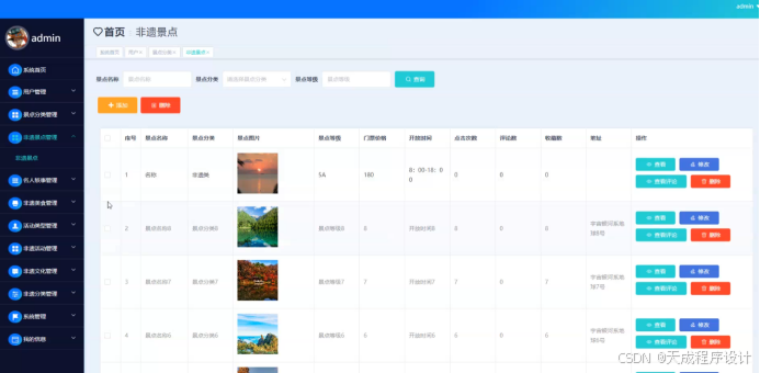管理员点击非遗景点管理。进入非遗景点管理页面输入景点名称、景点等级、景点分类可以查询、添加或删除非遗景点管理信息,并进行查看、修改、查看评论或删除等操作。如图5-9所示: