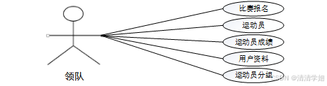 领队的功能主要是对运动员、比赛报名、运动员成绩、运动员分组、用户资料等功能进行操作。领队用例分析图,如图3-3所示。