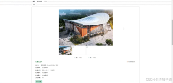 赛事信息:在赛事信息页面的输入栏中输入比赛名称进行查询,可以查看到赛事详细信息;并根据需要进行赞、踩、报名比赛、评论或收藏操作;赛事信息页面如图5-3所示: