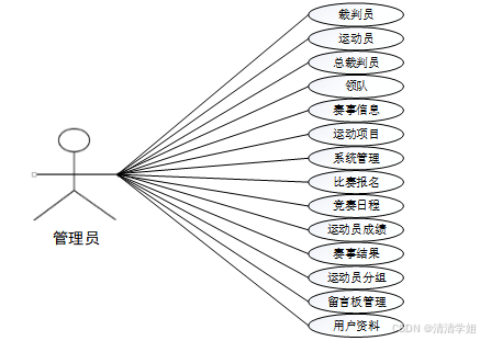 管理员端的功能主要是开放给系统的管理人员使用,能够对其他用户的进行管理,主要有裁判员、运动员、总裁判员、领队、赛事信息、运动项目、比赛报名、竞赛日程、运动员成绩、赛事结果、运动员分组、留言板管理、系统管理、用户资料等功能。并进行查看,修改和删除等操作,对系统整体运行情况进行了解。管理员用例分析图,如图3-1所示。